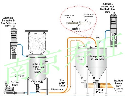 在進料閥的控制下物料從料斗進入發(fā)送器。物料在空壓機產(chǎn)生的高壓氣體的壓力下,料氣混合后,以一定的流速,經(jīng)管道送到終點的料氣分離設備,分離出物料進入料倉,氣體排入大氣。